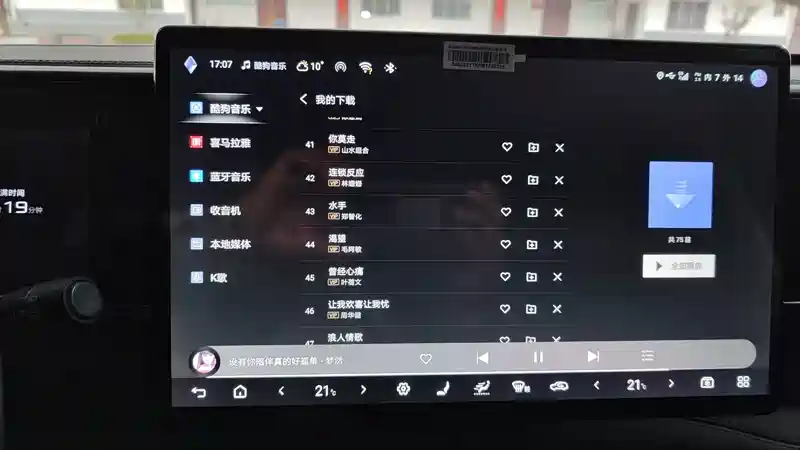 酷狗音乐能免费试用一年,就下载些无损音乐,音质效果很好,今天插上U盘,想把下载的音乐拷贝到U盘,试了很多路径、很多办法都无法实现。明明是下载了,在车机文件里就是找不到下载的歌曲,只能在酷狗应用里能看到已下载的歌曲。无法实现歌曲存到车机、或拷贝到U盘。U盘的歌曲可以拷贝到车机。
