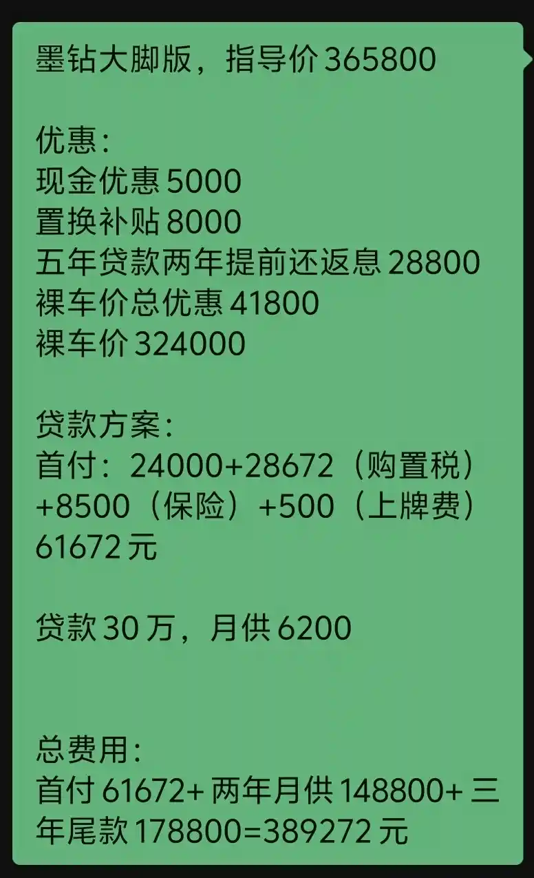 问 墨钻大脚的报价,去年年底订车的朋友,你们的落地价是多少? 删除 推荐精华 置顶 取消置顶 关闭回复 打开回复 推荐编辑 楼主禁言 移动帖子 重置头像 操作记录 弗里达 0浏览 · 2025-02-02 19:06· 发布于浙江 这是墨钻大脚的报价,有没有去年年底订车的朋友?你们的落地价是多少 举报 打开汽车之家 阅读体验更好 相关问题 更多 问烈马原厂前杠 0回答 问哪个版本烈马合适? 0回答 问野出个性,玩出态度! 0回答 问烈马是否有混动? 0回答 问选购车辆请求意见 0回答 问想买烈马大脚版 0回答 全部回复 只看楼主 雨后阳光880315 关禁闭 已屏蔽 五菱宏光 福特烈马墨钻大脚版此报价,优惠力度较大,裸车优惠41800元。但算上贷款总费用达389272元,相比指导价溢价不少。若对资金流动性要求高,贷款方案可行;若追求低价购车,可再谈裸车优惠或考虑其他购车方式。 2025-02-02 19:48 来自山东 回复 沙发 屏蔽此人 举报 删除 取消删除 禁言 重置头像 共有条对话 > 竹蜻蜓l 关禁闭 已屏蔽 捷豹XEL 现金优惠咋谈的?这个还没加国补的置换? 2025-02-08 22:01 来自山东 回复 板凳 屏蔽此人 举报 删除 取消删除 禁言 重置头像 共有条对话 > 还想在主楼增加内容?点击续写主楼内容 登录 参与更多互动 发表回复 打开App,查看更多评论 首 页 上一页 下一页 末 页 跳 转 取 消 还想在主楼增加内容?点击续写主楼内容 登录 参与更多互动 系统故障 发表回复 图片最多上传9张 微信好友 微信朋友圈 新浪微博 QQ好友 QQ空间 取消 相关推荐 加载中