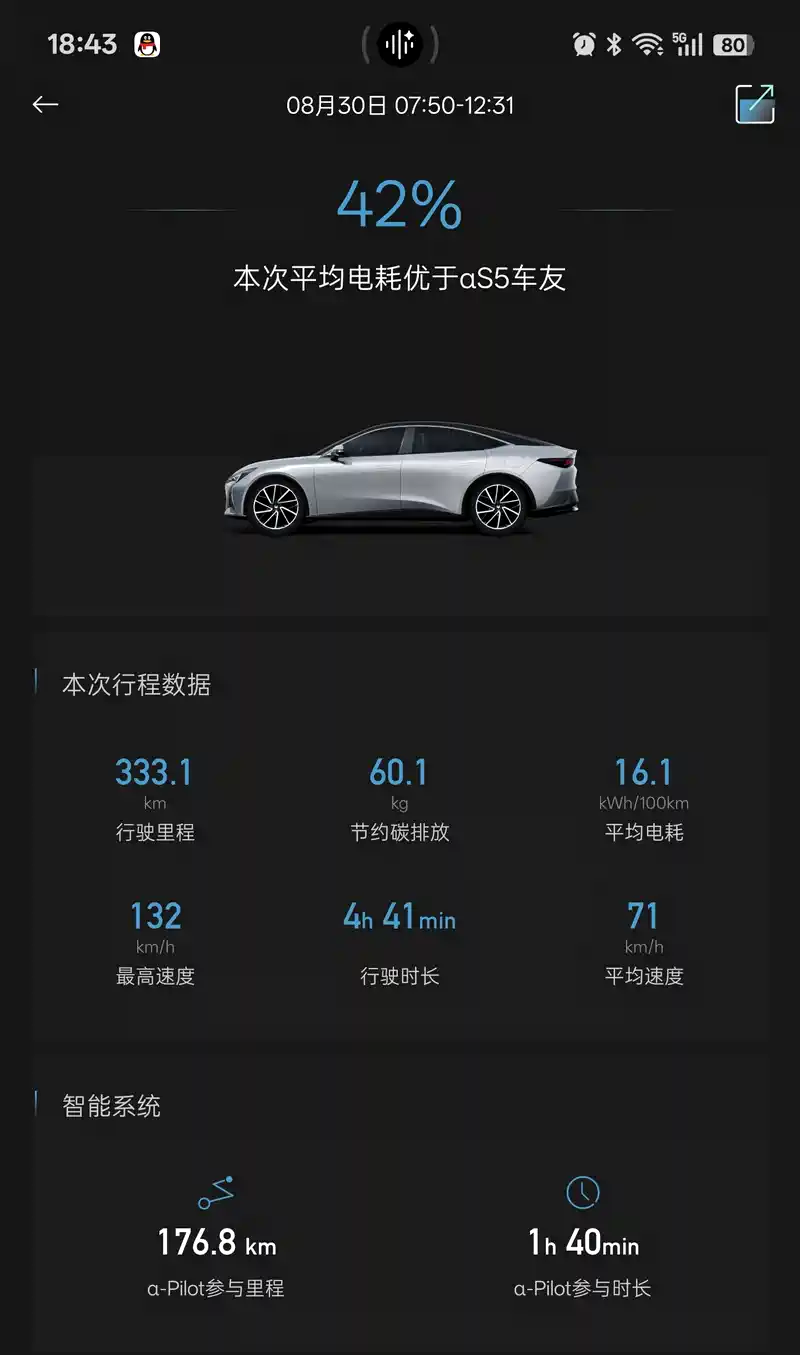 最近送小侄子去南京财经大学上学,开了330公里高速,定速120km/h,车里塞满行李应该算是满载。天气很热,30多度,空调开22度3档风。当时充满电出发,中间没充电,直接到目的地,电耗显示才16.1kWh/100km,感觉这个数据已经很惊喜了。但数据说,我这趟行程的电耗只优于42%的阿尔法S5车主。真离谱,大家咋跑的,电耗咋这么低呢?