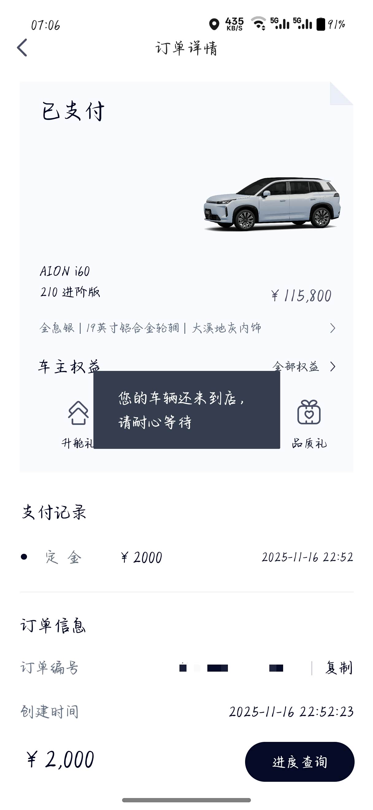 我下定第二天就显示未到店,问了销售是排产,耐心等待吧
