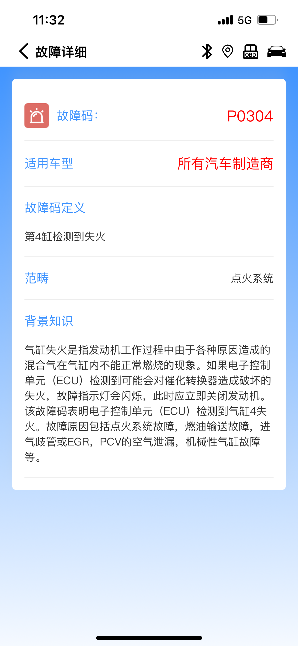 今天开车不一会,发动机故障灯闪烁,车子没感觉异常,过一会不闪了,OBD检测4缸失火,但开起来感觉无异常。兄弟们有遇到的吗?