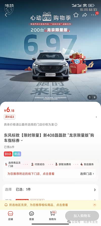 前天标志官方发文抢6.97的408,其实推文以及视频都说的很明白了,在京东的东风标致雪铁龙旗舰店如下图,即为店铺详情截图有点好奇,为什么店铺的ID在江苏无锡,有知道的吗?用京东扫码,可以直达店铺,省去搜索麻烦。开抢日期是6月1日的下午6.18分,总数量是200,但每日是多少数量不知道。看销量目前是6辆。昨天18点30分左右看,已被抢空,显示的销量是6辆,看今天下午06:18会释放多少。