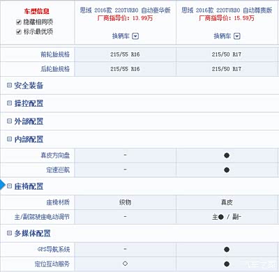 比较喜欢的是LED灯和定速巡航,但是听朋友说定速巡航只有在长途告诉的情况下才会用到,而且LED可以在4s店加装。想想也是,但是现在疑问就是,如果自己加装了LED和真皮座椅,到时候验车审车啥的,会不会比较麻烦?(ps:之前也是考虑到怕以后审查麻烦,才想直接上尊贵的),另外就是有没有官方渠道的加装LED灯?附上两个车型的对比(已隐藏相同项)