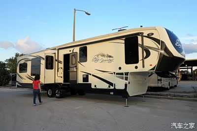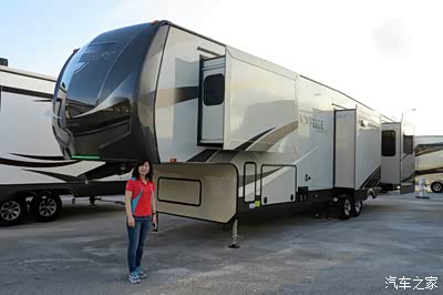 既然提不到车,就先不给大家看内部了,先看看外表吧,用老婆做模特,来对照一下大小,我们美国移动的家就是这个样子的!