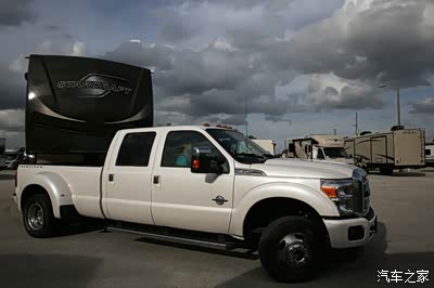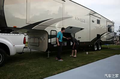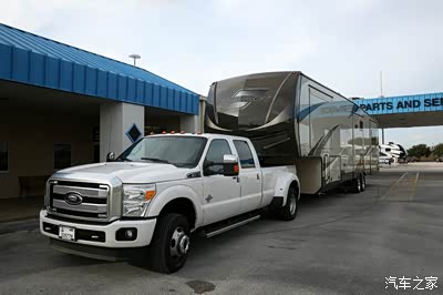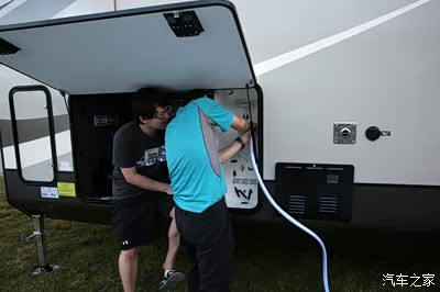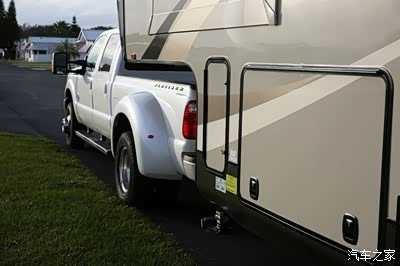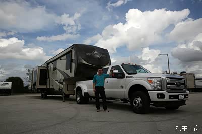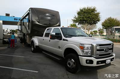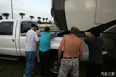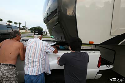 老美做事真的是很认真的,我们这个拖挂前后经过了2周的时间才提到车,但实际还是要感谢人家为我们用户想,考虑到我们的用车需要,要频繁移动换营地,没有把样车给我们是因为样车的大冰箱无法在行驶当中正常工作,只能使用营地的电源,而我们车的冰箱是可以自动转换使用外接电或者煤气工作的,可以在行走途中工作,这样就可以保证我们的食品不会出问题,这些天来效率虽然慢了一些,但服务还是比较到位的,今天是我们的提车日,公司配备了很多服务人员给我们,下面会一一介绍。这次有儿子在我们的沟通就没有问题了,第一步是帮我们把皮卡拖房车的配套拖钩,这是服务人员帮我们外购的。